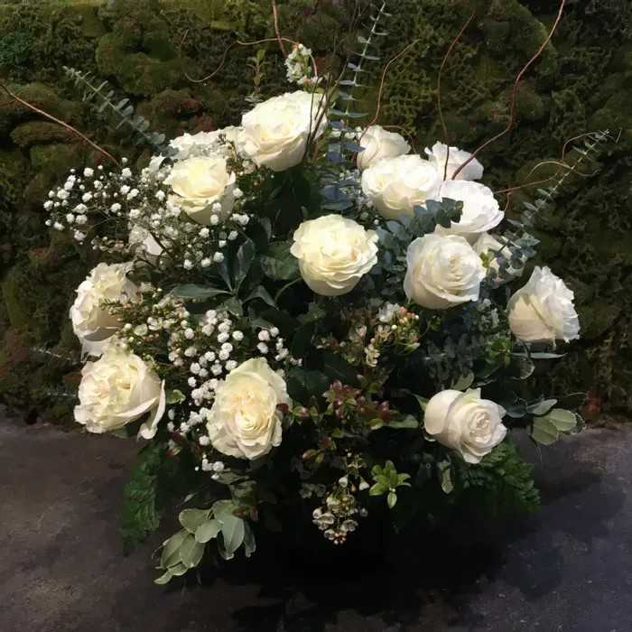 Timeless and graceful, this arrangement showcases two dozen pristine white roses, beautifully complemented by delicate baby’s breath, lush greenery, and textural accents. Thoughtfully arranged for a serene and sophisticated look, it’s a classic expression of love, remembrance, or peaceful elegance.