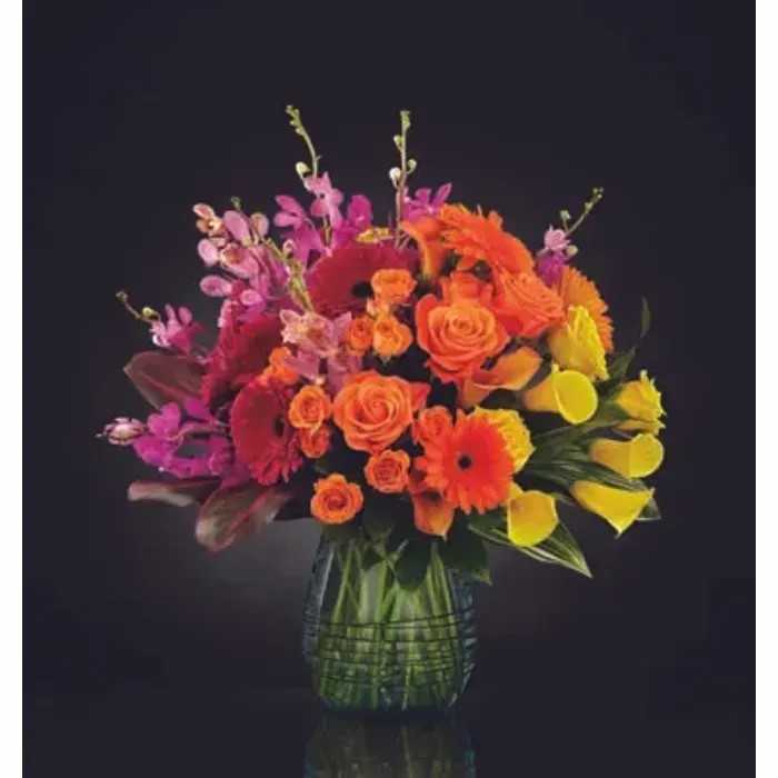 Bold, radiant, and unforgettable, this luxurious bouquet bursts with a kaleidoscope of color—featuring vivid orange roses, yellow calla lilies, hot pink orchids, gerbera daisies, and more. Arranged in an elegant glass vase, it’s a true celebration of beauty and brilliance, perfect for making a dazzling impression.