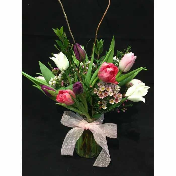 Delicate and delightful, this spring-inspired bouquet features a charming mix of pink, purple, and white tulips accented with fresh greenery. Arranged in a glass vase and tied with a soft ribbon, it’s a graceful gesture perfect for celebrating new beginnings, birthdays, or simply brightening someone’s day.