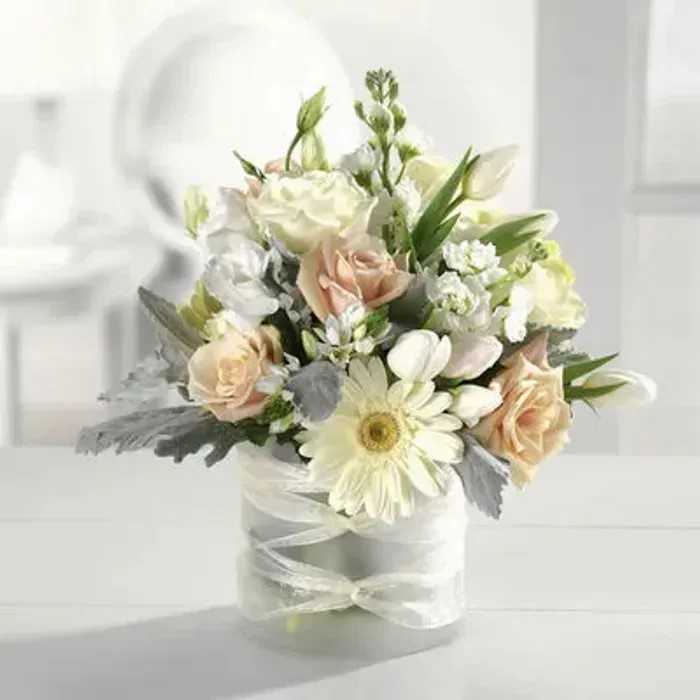 Delicate and dreamy, this charming bouquet features soft ivory, blush, and cream blooms—including roses, tulips, lisianthus, and a daisy gerbera—nestled among silver-toned foliage. Arranged in a satin-wrapped vase with a sheer ribbon, it’s the perfect expression of purity, grace, and heartfelt sentiment.