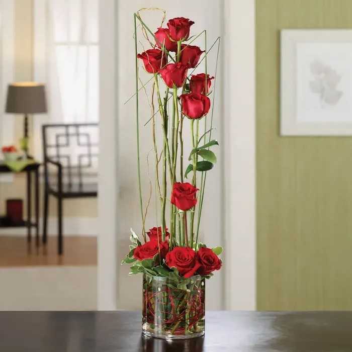Elegant and unexpected, this vertical arrangement features a line of striking red roses rising gracefully from a sleek glass vase. Accented with sculptural greenery and natural curly willow, it’s a contemporary twist on romance—perfect for modern spaces, artistic expressions, or a bold romantic statement.